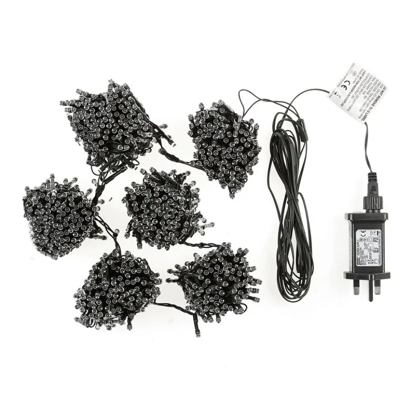 As our brightest range of LED lights ever, these Megabrights String Lights are ideal for an evenly spaced glow. The 5cm bulb spacing creates a perfectly even distribution of lights around your tree. The 1200 LEDs equate to a 60m lit length, ideal for use on an 8ft tree, plus there is a 5m lead cable which allows you to easily reach your nearest plug socket. These lights can be used indoors or outdoors; the transformer is IP20 rated and therefore should be plugged in to an indoor socket or a watertight box (not guaranteed to fit all types of watertight box).