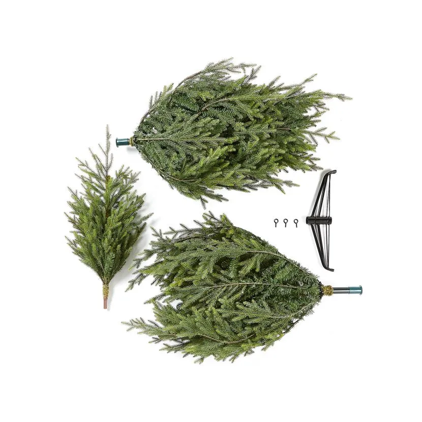 This tree features a 5-part hinged design which offers much easier assembly and dis-assembly over a hooked design. Simply connect the base and pole, unfold the branches and re-position them to your liking.